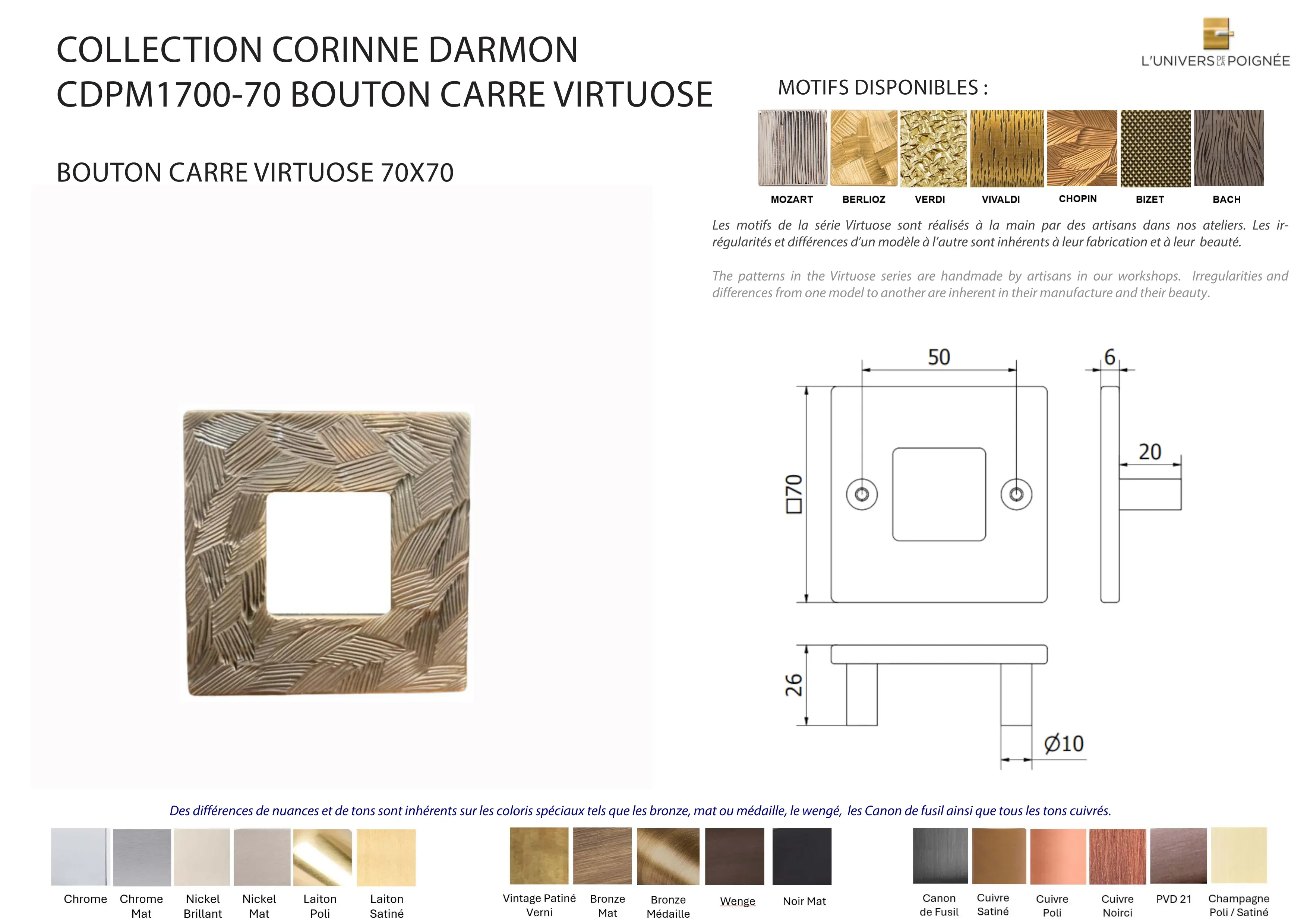 Bouton de meuble CD carré VIRTUOSE 70x70mm