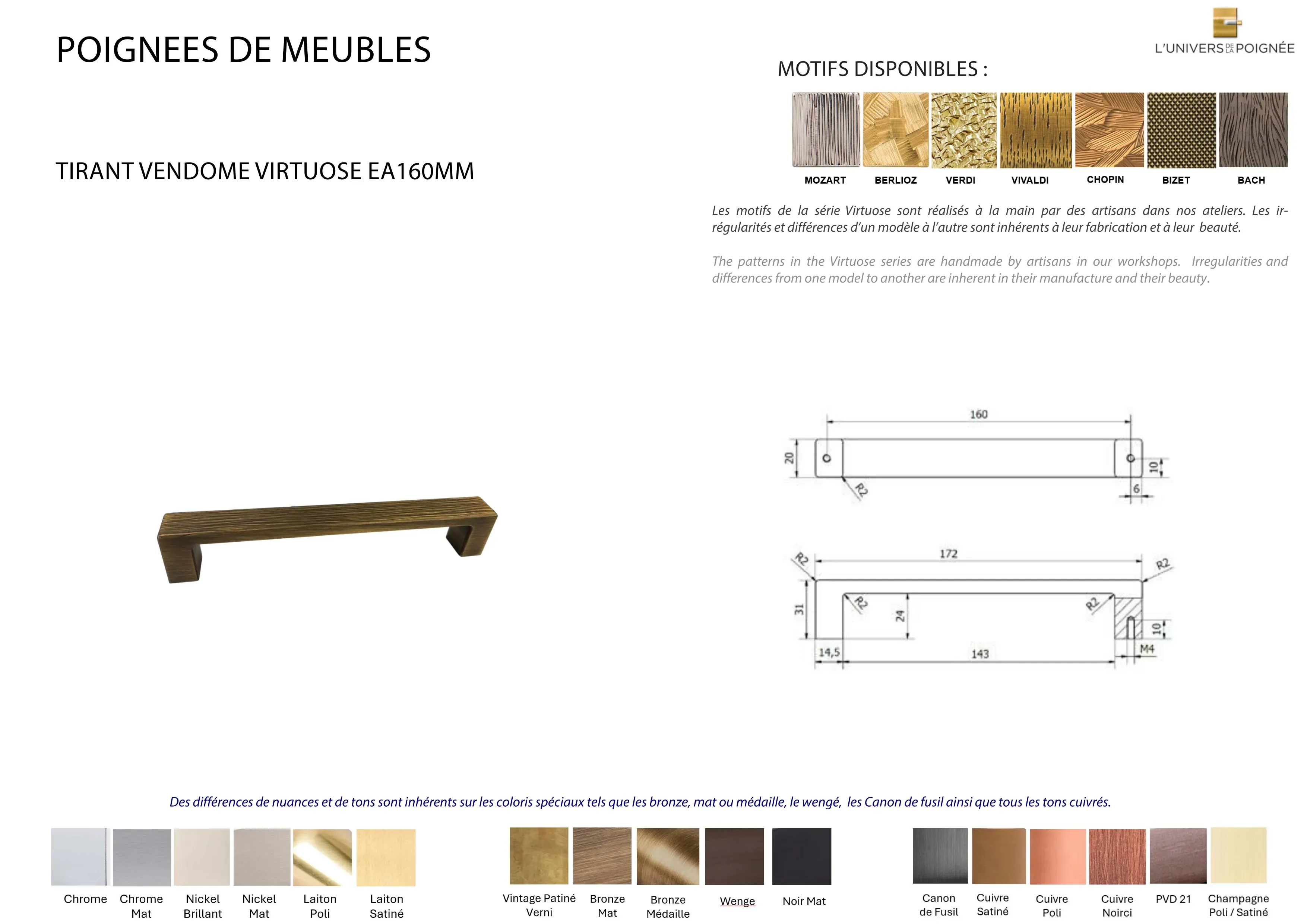Parce que chaque intérieur mérite une finition sur mesure, le tirant est disponible en plus de 15 coloris différents, parmi lesquels : Laiton satiné ; Laiton poli ; Chrome mat ; Chrome brillant ; Nickel mat ; Nickel brillant ; Bronze mat ; Bronze médaille ; Bronze vintage ; Wengé ; Blanc ; Noir mat ; Canon de fusil ; Cuivre satiné ; Cuivre brillant ; Cuivre noirci ; Champagne mat ; Champagne brillant